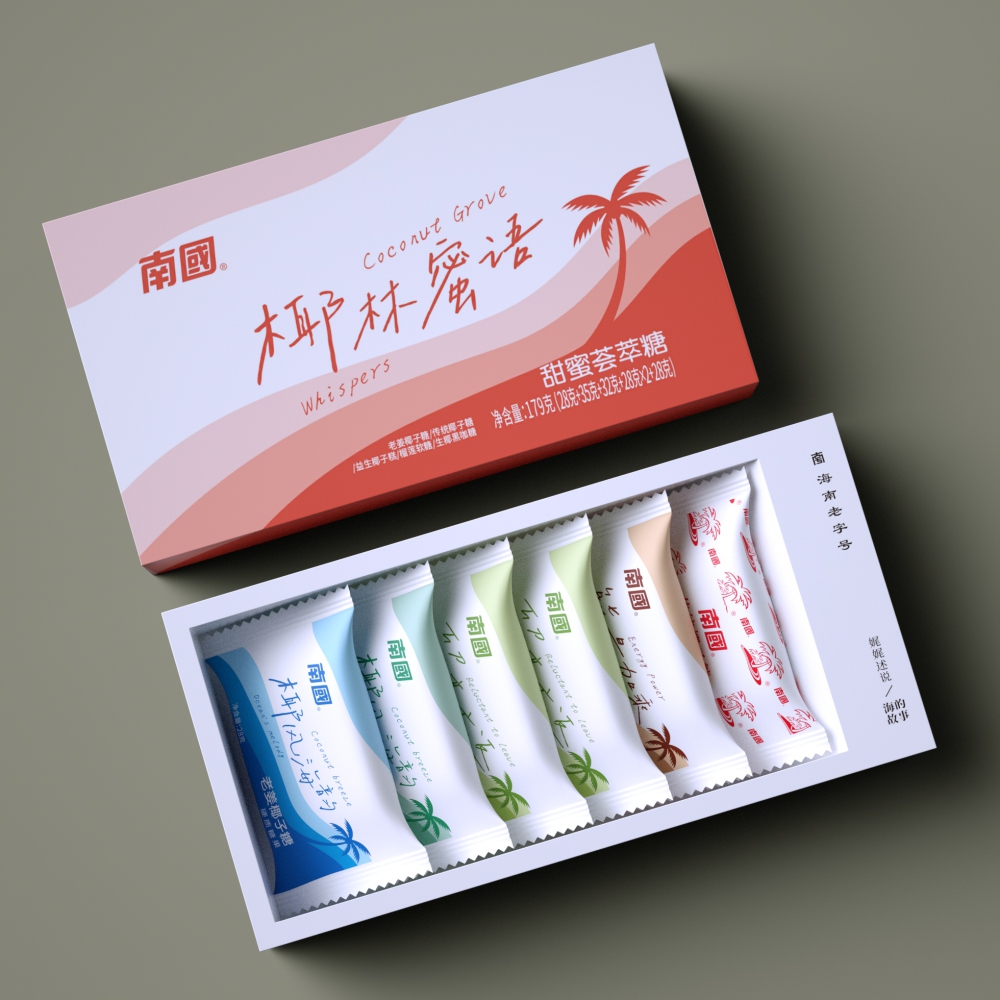 椰林蜜语甜美荟萃糖,,,,,,四款韵味浓情交错,,,,,,带你穿越海南椰林的香甜秘境,,,,,,无论是午后茶歇、团圆分享还是伴手礼,,,,,,这份热带甜美都能传递海岛的周到与心意。。。。。。